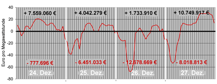Den spärlichen Erlösen von 24,08 Millionen Euro, die zeitweise oberhalb der Nullgrenze erzielt wurden, standen Zuzahlungen von 27,93 Millionen Euro gegenüber. Insgesamt konnte so an diesen vier Tagen eine Strommenge von 3,33 Terawattstunden nur gegen einen Aufpreis von 3,85 Millionen Euro abgesetzt werden. Besonders krass war das Ungleichgewicht am zweiten Weihnachtsfeiertag, an dem für eine Strommenge von 873.884 Megawattstunden nur 1,73 Millionen Euro erlöst wurden, aber 12,68 Millionen Euro an Zuzahlung anfielen (siehe Grafik).