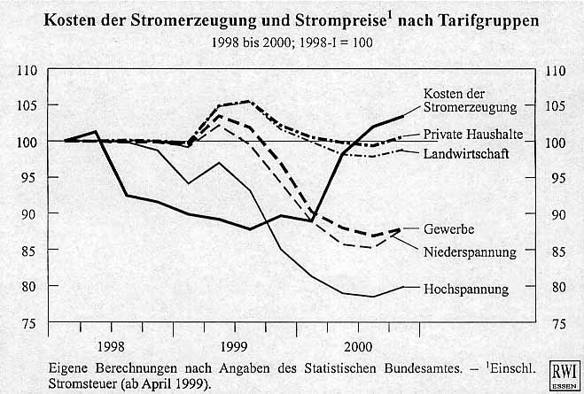 Für die Industrie sind die Preise seit der Liberalisierung trotz Stromsteuer (0,6 Pf/kWh seit 1.1.2001) um mehr als 25 Prozent gesunken. Auch bei Gewerbe und Landwirtschaft haben Preissenkungen die Zusatzbelastung durch die Stromsteuer (3,0 Pf/kWh seit 1.1.2001) mehr als kompensiert. Dagegen zahlten die privaten Haushalte Mitte 2000 mit 24,15 Pf/kWh etwa denselben Strompreis wie vor der Liberalisierung. Seite Anfang 2001 liegt der Strompreis für Haushalte mit durchschnittlich 25,50 Pf/kWh sogar deutlich höher (siehe Diagramm). Die stärksten Preissenkungen ergaben sich erst nach Verabschiedung der zweiten Verbändevereinbarung (991201), die das Durchleitungsverfahren vereinfachte.