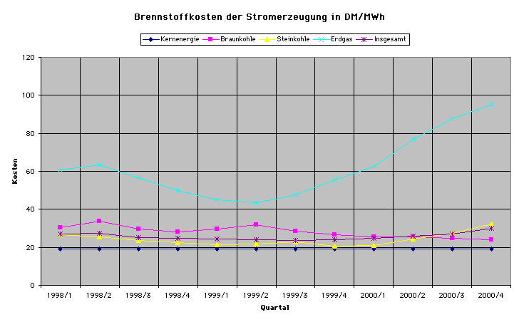 Zu Beginn der Liberalisierung wurden die Strompreissenkungen durch sinkende Brennstoffkosten erleichtert (siehe Diagramm). Der Preisauftrieb für Steinkohle und besonders für Gas hat diese Spielräume inzwischen beseitigt und die Brennstoffkosten insgesamt ansteigen lassen.
