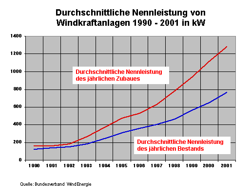 Die Windkraft hat sich im ersten Quartal des Jahres 2002 noch rasanter entwickelt als in den Jahren zuvor. Nach Angaben des Bundesverbands WindEnergie wurden allein in diesen drei Monaten 353 Windkraftanlagen (WKA) mit einer Nennleistung von insgesamt 457 Megawatt (MW) errichtet. Ende März waren bundesweit knapp 11.800 WKA mit einer Nennleistung von rund 9.200 MW installiert. Der Verband erwartet bis zum Jahr 2010 eine installierte Nennleistung von über 22.500 MW in Deutschland, darunter die ersten Offshore-Projekte (011119).