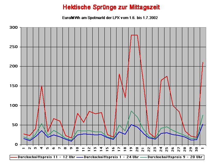 Am Spotmarkt der deutschen Strombörsen wurden im Juni ungewöhnliche Preisspitzen für Strom um die Mittagszeit notiert. So überschritt an der LPX der Market-Clearing-Price (MCP) zwischen 11 und 12 Uhr vom 1. Juni bis zum 1. Juli an zehn Tagen die Grenze von 100 Euro/MWh. Am 19. und 20. Juni erreichte er Höchstwerte von über 280 Euro/MWh. Auch der über 24 Stunden gemittelte Preis (base) erhöhte sich dadurch auf bis zu 52,09 Euro/MWh. Der Durchschnittspreis für die Zeit von 9 - 20 Uhr (peak) kletterte auf bis zu 85,57 Euro/MWh.