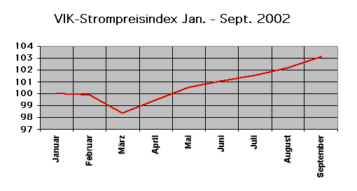 Der Verband der Industriellen Energie- und Kraftwirtschaft (VIK) veröffentlicht seit September wieder einen Strompreisindex. Er erfaßt die Preise für Mittelspannungskunden und ersetzt den früheren Dow Jones/VIK-Index, der im April 2002 eingestellt wurde (020410). Im Unterschied zu seinem Vorgänger nennt der neue Index keine Preise, sondern nur Relationen, die auf dem Januar 2002 als Bezugsmonat mit dem Wert 100 basieren. Nach dem alten Index galt zu diesen Zeitpunkt deutschlandweit ein durchschnittlicher Preis von 6,391 Cent pro Kilowattstunde für Industriestrom.