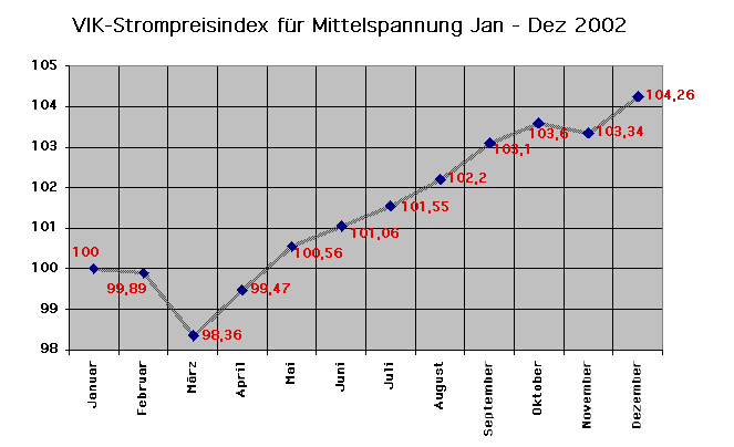 Ähnlich steigen die Preise bei den Haushaltskunden: Nach Berechnungen des Verbands der Elektrizitätswirtschaft (VDEW) belief sich die monatliche Stromrechnung eines deutschen Drei-Personen-Durchschnittshaushaltes mit mittlerem Stromverbrauch (3500 kWh/a) im Jahr 2002 auf 46,99 Euro. Im Jahr werde sie voraussichtlich auf 50,04 Euro steigen und damit die Stromrechnung des Jahres 1968 (49,95 Euro) wieder übertreffen.