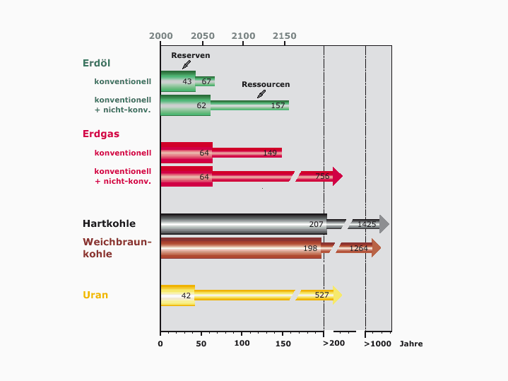 Die sogenannte statische Reichweite (Division der heute bekannten Reserven durch den heutigen Jahresverbrauch) gibt die Studie für Öl mit 43 Jahren an (Reserven) bzw. 67 Jahren (Ressourcen). Für Erdgas liegen die entsprechenden Werte bei 64 bzw. 149 Jahren. Für Kohle werden die Reserven auf rund 200 Jahre und die Ressourcen auf weit mehr als tausend Jahre geschätzt (siehe Grafik).