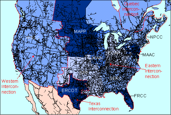 Diese Karte zeigt das nordamerikanische Hochspannungsnetz