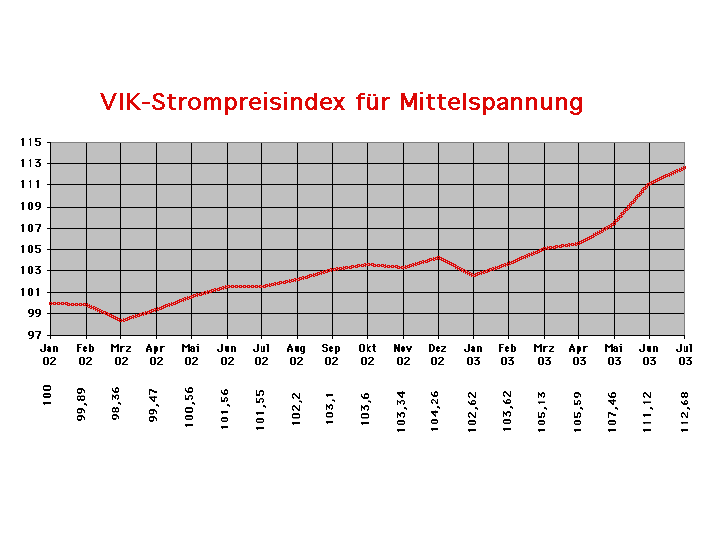 Der VIK-Strompreisindex für Mittelspannungskunden, der im Januar 2002 mit dem Index 100 startete, stieg im August 2003 erneut um 1,4 Prozent gegenüber dem Vormonat auf nunmehr 112,68 Punkte (siehe Grafik).