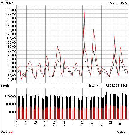 Die Stromverknappung infolge der sommerlichen Hitzewelle (030801) ließ die Strompreise an den Spot- und Terminbörsen erneut in die Höhe schießen. An der deutschen Strombörse EEX in Leipzig stieg am 7. August der tagesgewichtete Duchschnittspreis für Spitzenlast (8 bis 20 Uhr) auf 115,94 Euro/MWh und für Grundlast (1 bis 24 Uhr) auf 73,17 Euro/MWh. Schon am 15. Juli hatten die Preise für Spitzen- und Grundlast den Rekordstand von 174,86 bzw.102,39 Euro/MWh erreicht. Eine weitere Preisspitze folgte am 22. Juli mit 130,47 bzw. 78,78 Euro/MWh (siehe Grafik). Für Stromlieferungen zur Mittagszeit überschritt der Preis am 25. Juni, 22. Juli und 7. August die Grenze von 300 Euro/MWh und erreichte am 15. Juli mit 492,43 Euro/MWh seinen Höchststand. Auch die Preise am Terminmarkt, die bereits seit Frühjahr beständig nach oben weisen, zogen nochmals verstärkt an. Marktbeobachter gehen deshalb davon aus, daß die Strompreise mittelfristig weiter steigen werden.