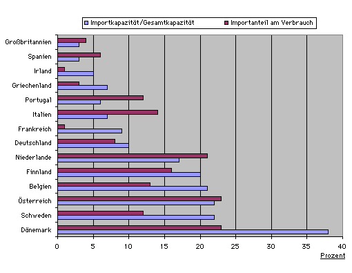 Dieses Diagramm zeigt für jeden Mitgliedsstaat der EU die Gesamteinfuhrkapazität aus allen mit ihm verbundenen Ländern im Verhältnis zur eigenen installierten Gesamtstromerzeugungskapazität. Darüber hinaus zeigt das Diagramm den Anteil der tatsächlichen Einfuhren am nationalen Verbrauch, aus dem sich schließen läßt, in welchem Umfang die Verbindungsleitungen für Einfuhren genutzt werden (Frankreich nutzt seine Verbindungsleitungen hauptsächlich für Ausführen, die in diesem Diagramm nicht ersichtlich sind).