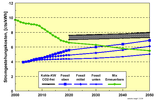 Nach dieser Grafik aus der BMU-Studie würde die Wirtschaftlichkeitslücke zwischen regenerativer und konventioneller Stromerzeugung frühestens 2030 geschlossen, sofern die Stromgestehungskosten eines "repräsentativen Mix an erneuerbaren Energien" (grüne Kurve) im erhofften Maße sinken und Strom aus Kohle in der teuersten von drei Preisvarianten (blaue Kurve) mit 15 Euro pro Tonne Kohlendioxid belastet wäre. Um Sie bereits 2010 zu schließen, müßte der Preis der CO2-Zertifikate auf 60 Euro pro Tonne klettern. Im Jahre 2020 wären 30 Euro pro Tonne erforderlich. Das obere schwarze Feld markiert die ungefähren Stromgestehungskosten von Kohle-Kraftwerken mit CO2-Rückhaltung, mit deren Einsatz nicht vor 2020 gerechnet wird. |