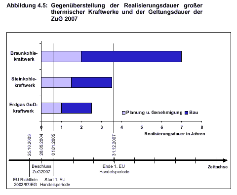 Wie das jetzt vorgelegte Gutachten hervorhebt, sind die Planungs- und Bauzeiten für Braunkohlekraftwerke viel zu lang, als daß von den diesbezüglichen Vergünstigungen des Zuteilungsgesetzes 2007 überhaupt ein Anreiz zum Bau neuer Braunkohlekraftwerke ausgehen könnte (siehe Grafik). Dies bedeute, daß das Gesetz lediglich Mitnahmeeffekte bei solchen Braunkohlekraftwerken bewirke, deren Bau ohnehin vorgesehen war. Steinkohle- und Gaskraftwerke benötigten für Planung, Genehmigung und Bau ebenfalls so viel Zeit, daß das Zuteilungsgesetz 2007 allenfalls unter günstigen Umständen die Neuerrichtung von effizienteren Anlagen stimulieren könnte, die pro erzeugter Kilowattstunde weniger CO2 emittieren.