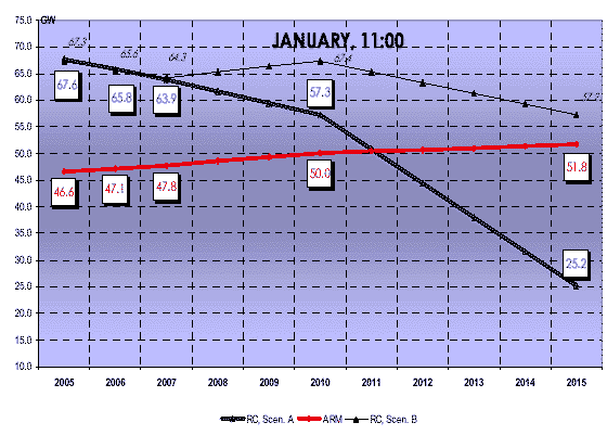 Die rote Linie auf dieser Grafik (Adequacy Reference Margin - ARM) zeigt, wie groß die verbleibende Leistung (remaining capacity - RC) in den Jahren bis 2015 voraussichtlich sein müßte, um eine zuverlässige Versorgung zu gewährleisten. Als verbleibende Leistung gelten fünf Prozent der gesamten Erzeugungskapazität abzüglich Ausfälle, Revision, Reserve und sonstiger nicht einsetzbarer Leistung. Die dicke schwarze Linie verdeutlicht die tatsächlich verbleibende Leistung, falls bis 2015 nur solche Kraftwerke zur Verfügung stünden, die vorhanden oder bereits heute fest geplant sind. Die dünne schwarze Linie folgt dagegen einem günstigeren Szenario, das auf den Prognosen der Verbundnetzbetreiber über die wahrscheinliche Entwicklung der Kraftwerkskapazitäten beruht. Als Referenzzeitpunkt dient jeweils der dritte Mittwoch im Januar, 11 Uhr.