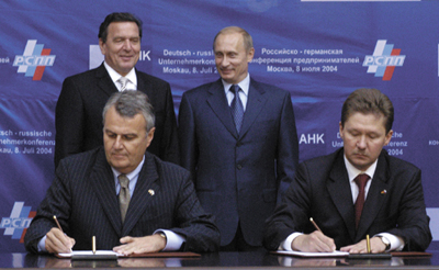Der frühere Bundeskanzler Gerhard Schröder (SPD) übernimmt den Vorsitz im Aufsichtsrat der "North European Gas Pipeline Company" (NEGP), die vom russischen Staatskonzern Gazprom gemeinsam mit den deutschen Gasversorgern E.ON und BASF gegründet wurde, um das Projekt einer Gas-Pipeline durch die Ostsee zu verwirklichen und anschließend zu betreiben (050902). Dies teilte Gazprom am 9. Dezember mit, als in Rußland mit dem Bau des ersten Abschnitts der Pipeline begonnen wurde. Gazprom hält an der in der Schweiz registrierten Gesellschaft mit 51 Prozent die Mehrheit und bestimmt deshalb auch den Aufsichtsratsvorsitzenden. Der Rest verteilt sich zu gleichen Teilen auf E.ON und BASF. Schröders Berufung erfolgte somit auf Wunsch von Gazprom bzw. des russischen Präsidenten Putin, mit dem Schröder das Projekt in seiner Amtszeit als Bundeskanzler politisch unterstützt und durchgesetzt hatte (siehe Fotos). Angesichts dieser Vorgeschichte und der mafiösen Strukturen der russischen Politik und Wirtschaft wird Schröders Wechsel vom Kanzler der Bundesrepublik Deutschland zum Gazprom-Angestellten weithin als skandalös empfunden, zumal der Staatskonzern auch eine aktive Rolle bei der Gleichschaltung der russischen Medien spielt.