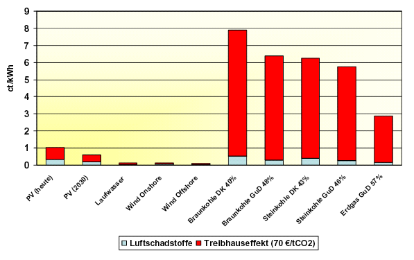 Nach diesem Gutachten ergeben sich für die Stromerzeugung aus Stein- und Braunkohle - selbst unter Berücksichtigung moderner Technik - externe Kosten in einer Größenordnung von 6 bis 8 Cent pro Kilowattstunde (kWh). Für moderne, gasgefeuerte Gaskraftwerke liegen sie immer noch bei etwa 3 Cent/kWh (siehe Grafik).