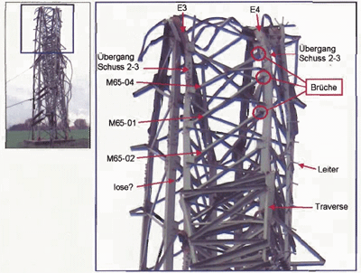 Auf diesen abgeknickten Winkelabspannmast M 65, der bei Nünning an der Leitung Gronau - Coesfeld den Umbruch von acht benachbarten Masten auslöste, konzentrierten sich die Untersuchungen der Bundesanstalt für Materialforschung. Auslöser war demnach eine der rot markierten Diagonal-Verstrebungen aus Thomasstahl. Der aus dem Jahr 1960 stammende Mast war an dieser Stelle bereits saniert worden. Das Ergebnis läßt sich auf andere Schadensstellen übertragen.
