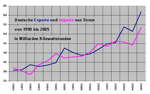 Die physikalischen Stromflüsse über deutsche Grenzen hinweg haben 2005 den bisher stärksten Anstieg erlebt. Sowohl die Exporte als auch die Importe erhöhten sich gegenüber dem Vorjahr um mehr als 20 Prozent. Gegenüber 1990 haben sich damit beide etwa verdoppelt. Dies ergibt sich aus Angaben, die der Verband der Netzbetreiber (VDN) veröffentlichte (siehe Grafik und Tabelle 1).