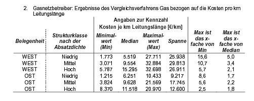 Etwas geringer sind die Schwankungsbreiten der Netzkosten bei den Gasnetzbetreibern. Hier liegt das teuerste Unternehmen um mehr als das 15-fache über dem billigsten Netzbetreiber derselben Strukturklasse. Der Mittelwert einer Strukturklasse wird bis zum fünffachen übertroffen (siehe Tabelle 2).