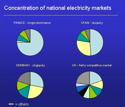 Mit dieser Grafik illustriert die EU-Kommission die verschiedenen Formen der Marktbeherrschung durch einen (Frankreich), zwei (Spanien) oder vier Konzerne (Deutschland). Lediglich in England sieht sie die Voraussetzungen für Wettbewerb auf dem Strom- und Gasmarkt als erfüllt an.