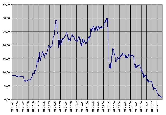 Preise für Emissionszertifikate an der EEX vom 1.11.2004 bis zum 27.2.2007