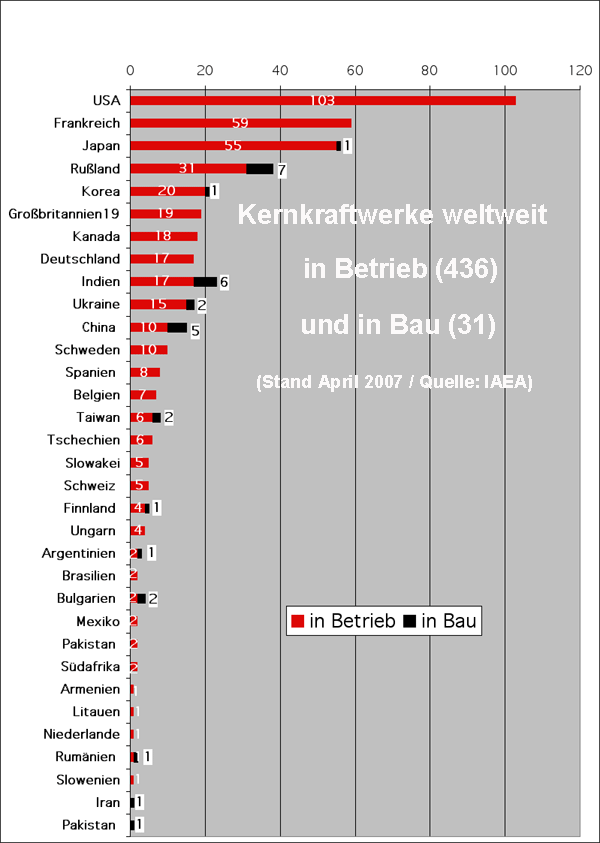 Die Unzuverlässigkeit der INES-Ereignisskala ergibt sich demnach schon daraus, daß die USA, die mit 103 Anlagen mit Abstand die meisten Kernkraftwerke betreiben (siehe Grafik), seit der Einführung von INES 199 nur 22 Ereignisse an die IAEA weitergeleitet hätten, darunter sechs der Stufe 0, sieben der Stufe1, fünf der Stufe 2 und eines der Stufe 3. Dagegen habe Deutschland, das nur 17 Anlagen betreibt, im selben Zeitraum 2.200 Ereignisse der Stufe 0 gemeldet, während 72 Ereignisse der Stufe 1 oder höher zugeordnet wurden. Der Grund dafür sei sicher nicht in einer höheren Störanfälligkeit der deutschen Anlagen zu suchen, sondern im unterschiedlichen Meldeverhalten der national zuständigen Behörden und ihrer unterschiedlichen Bewertung der jeweiligen Relevanz der Ereignisse nach der INES-Skala.
