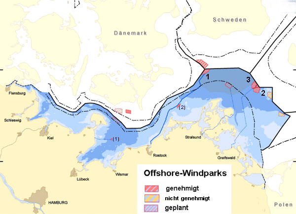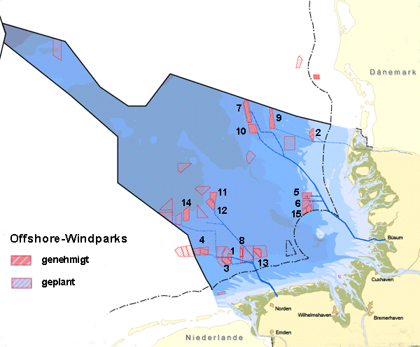 Vor der deutschen Küste sind insgesamt mehr als 30 Windparks mit einer Nennleistung von über 40.000 Megawatt geplant. Für die Genehmigung ist in der Regel das Bundesamt für Seeschiffahrt und Hydrographie (BSH) zuständig, da sich fast alle Anlagen in der sogenannten Ausschließlichen Wirtschaftszone (AWZ) befinden, die an die maximal zwölf Seemeilen großen Hoheitsgewässer anschließt und bis zu 200 Seemeilen umfaßt. Als ersten Windpark genehmigt das BSH im November 2001 "Borkum West" (011119), als zweiten "Butendiek" westlich von Sylt (021213). Insgesamt hat das Amt bisher in der Nordsee den Planungen für 1097 Windkraftanlagen mit einer Nennleistung von knapp 5000 MW zugestimmt. In der Ostsee wurden bisher 530 Anlagen mit knapp 1000 MW genehmigt und zwei Projekte aus Gründen des Vogelschutzes abgelehnt (050109). Außerdem gibt es in der Ostsee zwei weitere Windparks, die sich innerhalb der Zwölf-Meilen-Zone befinden und deshalb von den Landesbehörden genehmigt wurden (siehe Karten).