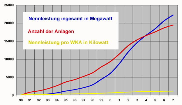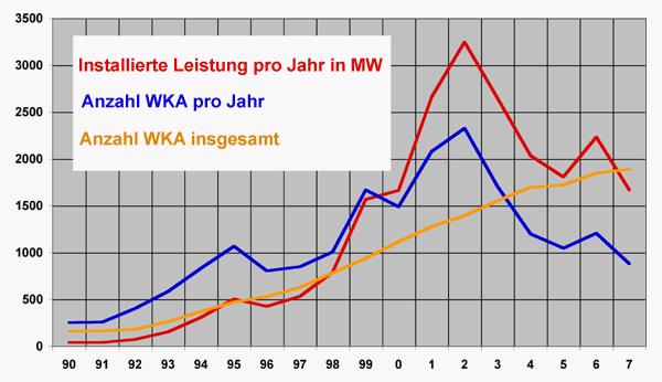 Die Zahl der in Deutschland vorhandenen Windkraftanlagen hat sich im vergangenen Jahr um 883 auf 19.460 erhöht. Die Nennleistung stieg um 1625 auf 22.247 Megawatt (siebe Grafik 1). Im Vergleich mit dem Vorjahr wurden allerdings 325 Anlagen weniger und eine um 566 MW geringere Nennleistung installiert. Der seit 1990 andauernde Windkraftanlagen-Boom, der 2002 seinen Gipfel erreichte, hat sich damit nach dem zeitweiligen Aufschwung des Jahres 2006 wieder abgeschwächt (siehe Grafik 2). Dies geht aus Angaben hervor, die das Deutsche Windenergie-Institut (DEWI) am 22. Januar veröffentlichte.