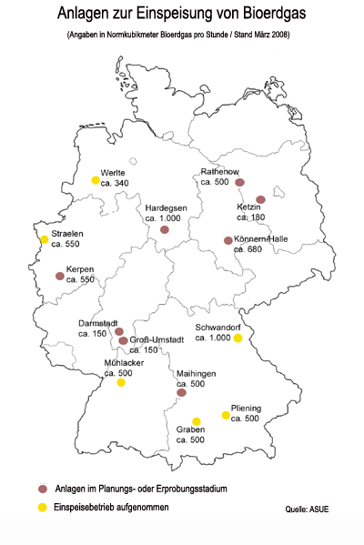 Die Aufbereitung von Biogas auf Erdgasqualität ist technisch aufwendig und teuer. Die Einspeisung in die Pipelines lohnt sich deshalb nur für größere Mengen und mit Hilfe des Erneuerbare-Energien-Gesetzes: Nach § 8 Abs. 1 EEG gilt aus einem Gasnetz entnommenes Gas als Biomasse, "soweit die Menge des entnommenen Gases im Wärmeäquivalent der Menge von an anderer Stelle im Geltungsbereich des Gesetzes in das Gasnetz eingespeistem Gas aus Biomasse entspricht". Die Mindestvergütungen erhöhen sich um weitere Beträge, wenn das eingespeiste Biogas aus nachwachsenden Rohstoffen stammt (Pflanzen, Gülle), als Brennstoff für KWK-Anlagen dient oder auf Erdgasqualität aufbereitet wurde. Im Idealfall profitiert Bioerdgas zuzüglich zur Grundvergütung von allen drei Sonder-Boni. Je nach Leistung der Stromerzeugungsanlage beträgt dann im laufenden Jahr die EEG-Vergütung zwischen 20,83 Cent/kWh (bis 150 kW) und 9,91 Cent/kWh (bis 20 MW).