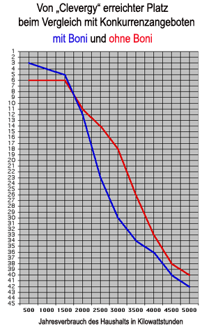 "Clevergy" hat es offenbar besonders auf Kleinstverbraucher mit einem Jahresverbrauch bis 1500 kWh abgesehen, wie dieser Vergleich anhand der Stuttgarter Postleitzahlenregion 70178 zeigt (Stand 26.3.06 / Quelle: Verivox). Aber auch in diesem Segment belegt Clevergy mit "Click & Service" bestenfalls den dritten Platz, sofern der einmalig gewährte Bonus berücksichtigt wird. Ohne Boni kommt er nur auf den sechsten. Und bei 2000 kWh beginnt dann mit und ohne Boni ein steiler Absturz auf die hinteren Plätze. Als Durchschnittswert für den Verbrauch eines 3-Personen-Haushalts gelten 3500 kWh.