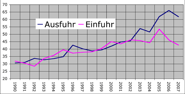 In der aktuellen Diskussion um den Ausstieg aus der Kernenergie und den Neubau von Kohlekraftwerken verweisen Kritiker gern auf den anhaltend hohen Exportüberschuß, um die von der Stromwirtschaft beschworene Kraftwerkslücke (080308) zu bezweifeln. Bemerkenswert ist in der Tat, daß im Jahr 2007 trotz einer drastischen Drosselung der deutschen Atomstromproduktion um 25 TWh, die auf den zeitweisen Stillstand von bis zu sieben Anlagen zurückzuführen war, der Exportüberschuß erneut mehr als 19 TWh betrug. Vermutlich wäre der Überschuß bei normaler Atomstromproduktion noch höher als im Vorjahr gewesen. Insofern dürfte das Abfallen der Export-Kurve mit dem ausgeprägten Knick in der Atomstromproduktion zu tun haben (siehe 080406).