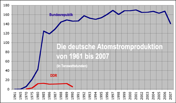 Die deutschen Kernkraftwerke erzeugten 2007 nur 140,5 Terawattstunden (TWh) brutto bzw. 133,2 TWh netto. Die Atomstromproduktion lag damit auf dem niedrigsten Stand seit 1987 (129,5 TWh brutto). Im Vergleich zum Vorjahr war die Nettoerzeugung um 25,5 TWh niedriger. Diese Minderung entspricht etwa dem gesamten Stromverbrauch Irlands oder dem der Slowakei. Dies geht aus den neuesten Zahlen zur Stromproduktion des vergangenen Jahres hervor, die vom Bundeswirtschaftsministerium und vom Bundesamt für Strahlenschutz (BfS) veröffentlicht wurden.