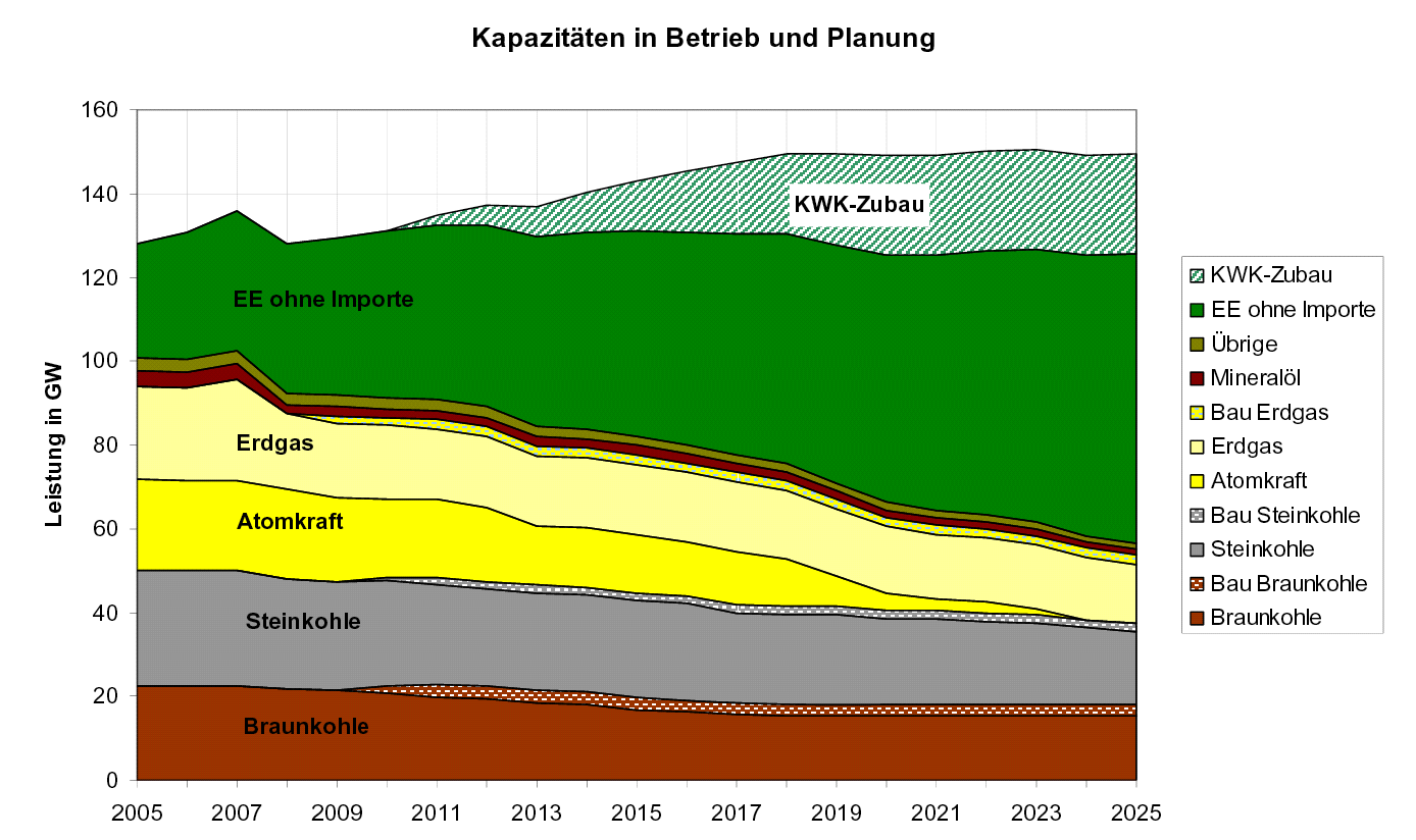 Die im Bau befindliche oder bis 2018 geplante Steinkohle-Leistung von 20.369 MW würde im Vergleich mit der im Jahre 2006 installierten Kapazität der Steinkohle-Kraftwerke (28.700 MW) gut siebzig Prozent ausmachen. Beim Erdgas wären es 42 Prozent der gegenwärtig installierten Leistung und bei der Braunkohle 16 Prozent. Unter der Annahme eines gleichbleibenden Stromverbrauchs und des völligen Ausstiegs aus der Kernkraft (21.200 MW im Jahr 2006) stünden bis 2018 zur Deckung des Ersatzbedarfs an Kraftwerken noch 13.000 MW zur Verfügung.