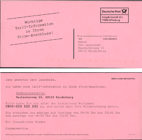 Durch namentliche Adressierung und amtlich-ärmliche Aufmachung erwecken die rosaroten Karten der ESD den Anschein, als ob sie vom jeweiligen Grundversorger der "Verbrauchsstelle" stammen würden