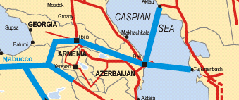 Die 3300 Kilometer lange Nabucco-Leitung soll die EU ab dem Jahr 2013 an die Erdgasquellen im kaspischen Raum anschließen (060605). In das Projekt ist im Frühjahr auch der Essener RWE-Konzern als Partner eingestiegen (080206). Es dient in erster Linie dem Zweck, die Abhängigkeit Europas von russischen Erdgaslieferungen zu vermindern. Der russische Einmarsch in Georgien dürfte deshalb die EU eher noch bestärkt haben, Nabucco zu verwirklichen.