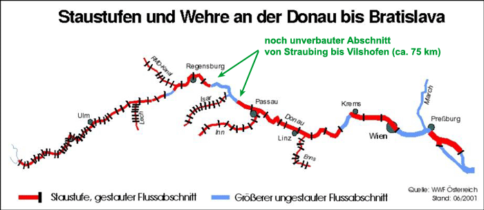 Die Verbauung der 75 Kilometer langen Fließstrecke zwischen Straubing und Vilshofen, die nach Inbetriebnahme der Kraftwerks-Staustufe Straubing im Jahre 1995 übrig blieb, ist seit Anfang der neunziger Jahre geplant und umstritten. Der Verzicht auf weitere Staustufen wurde vom Bundestag im Juni 2002 nach einer Experten-Anhörung im Verkehrsausschuß beschlossen und vier Monate später auch in den energiepolitischen Teil der Koalitionsvereinbarung zwischen SPD und Grüne übernommen (021001). Die Rhein-Main-Donau AG beantragte daraufhin im November 2003 die Durchführung des Raumordnungsverfahrens für die "sanfte" Variante zur Erhöhung der Fahrwassertiefe. Die Bezirksregierung von Niederbayern erweiterte das Raumordnungsverfahren aber eigenmächtig um zwei weitere Varianten. Die eine sah die Errichtung einer Staustufe bei Aicha vor (mit Durchstich der Mülhamer Schleife), die andere den Totalausbau mit drei Staustufen bei Waltendorf, Aicha und Vilshofen. Im März 2006 schloß die Bezirksregierung das Raumordnungsverfahren ab und gelangte zu dem Ergebnis, daß lediglich die Variante mit einer Staustufe bei Aicha als raum- und umweltverträglich anzusehen sei.