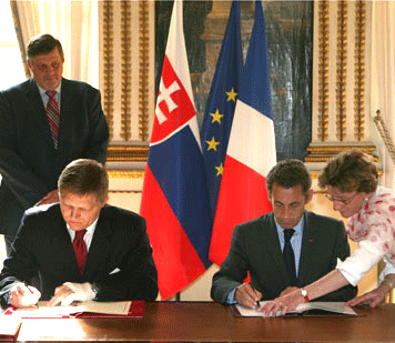 Noch ein Kunde für den EPR: Frankreichs oberster Reaktor-Verkäufer Sarkozy und der slowakische Premier Fico (links) unterzeichnen das Abkommen über nukleare Kooperation. |