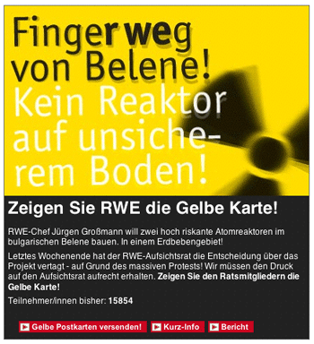 | Während RWE sein anfängliches Schweigen zur Zuschlagserteilung aufgegeben hat und nun mit einem "Belene Special" auf seinen Internet-Seiten kräftig die Werbetrommel für den Einstieg in die osteuropäische Atomstromproduktion rührt (rechts), machen Kernkraftsgegner ihrerseits mobil und fordern im Internet dazu auf, dem Konzern die "Gelbe Karte" zu zeigen (links). | |