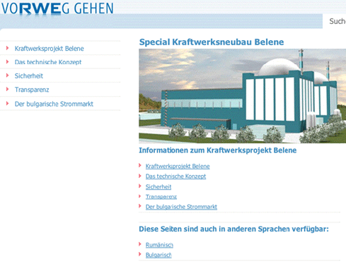 Nach wochenlangem Schweigen zur geplanten Beteiligung am bulgarischen Kernkraftwerk Belene gab der RWE-Konzern im November seine Zurückhaltung auf. Auf seinen Internet-Seiten, auf denen bisher kein Wort zu der bulgarischen Offerte zu finden war, begann er plötzlich mit einer umfangreichen Werbung für das Projekt. Außerdem unterzeichnete er eine erste Vereinbarung für eine Beteiligung am rumänischen Kernkraftwerk Cernavoda und bekundete seine Bereitschaft, auch beim neuen Kernkraftwerk Ignalina miteinzusteigen, das die drei baltischen Staaten planen.