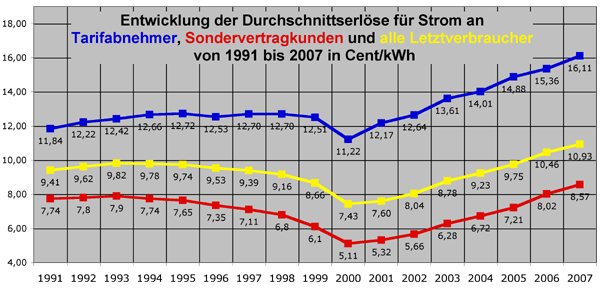 Bei der Abgabe an alle Letztverbraucher erlösten die Versorgungsunternehmen 2007 im Durchschnitt 10,93 Cent je Kilowattstunde. Bei Tarifkunden belief sich der Durchschnittserlös 16,11 Cent auf je Kilowattstunde. Diese Durchschnittserlöse enthalten wiederum die Netznutzungsentgelte, die Stromsteuer, die Konzessionsabgaben sowie Ausgleichsabgaben nach dem Erneuerbare-Energien-Gesetz und dem Kraft-Wärme-Kopplungsgesetz, nicht aber die Mehrwertsteuer und Stromsteuerrückzahlungen.