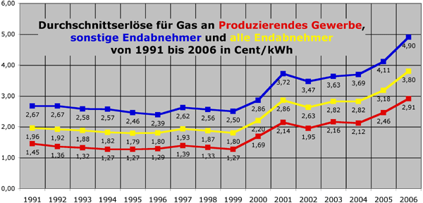 Besonders stark wuchsen die Durchschnittserlöse der Energieunternehmen beim Gasabsatz. Von 1999 bis 2006 stiegen sie für das Produzierende Gewerbe um 129 Prozent und für die sonstigen Gasabnehmer fast um das Doppelte. Auch hier muß überall noch die Mehrwertsteuer hinzugerechnet werden. |