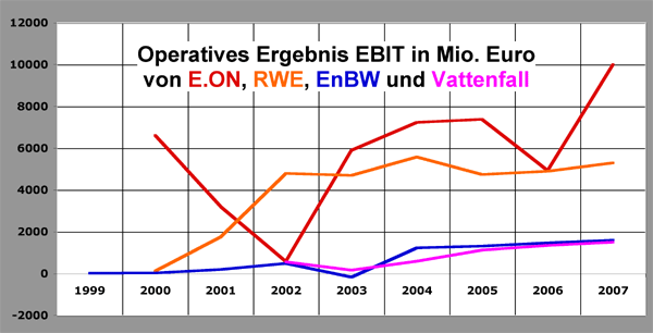 Die Studie nimmt das EBIT (Earnings before Interest and Tax) als aussagekräftigste Gewinnkennzahl, um die Entwicklung der Konzerngewinne nachzuzeichen. Beispielsweise stellt sich so heraus, daß bei RWE seit 2000, bei EnBW und Vattenfall seit 2003 eine Gewinnexplosion zu verzeichnen ist. Nur bei E.ON wird der steile Anstieg der Gewinnkurve seit 2003 im Jahr 2006 kurz unterbrochen (siehe Grafik 1 und Tabelle 1).