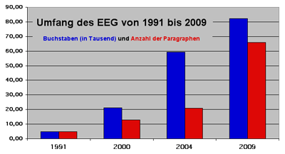 Das "Stromeinspeisungsgesetz" von 1991 kam noch mit knapp 5000 Buchstaben und 5 Paragraphen aus. Das jetzt in Kraft tretende EEG enthält 66 Paragraphen mit rund 83.000 Buchstaben. |