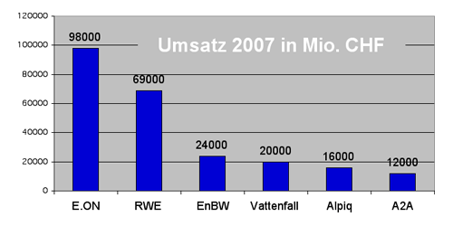 | Umsatzmäßig sieht sich der neue Schweizer Energiekonzern Alpiq gleich hinter dem deutschen Vattenfall-Konzern (Quelle: Alpiq/Geschäftsberichte 2007) |