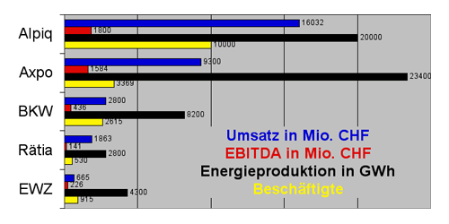 | Nach Zahl der Beschäftigten, Umsatz und Gewinn ist die neue Alpiq Holding AG das größte schweizerische Energieunternehmen. Bei der Stromproduktion hat jedoch die Axpo die Nase vorn (Quelle: Alpiq/Geschäftsberichte 2007) |