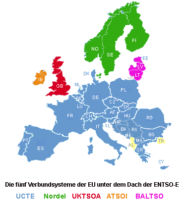 Die künftige ENTSO-E umfaßt wie die bisherige ETSO außer dem westeuropäischen Verbundsystem (UCTE) auch die Verbundsysteme Skandinaviens (Nordel), Großbritanniens (UKTSOA ), Irlands und Nordirlands (ATSOI) und der baltischen Länder (BALTSO). |