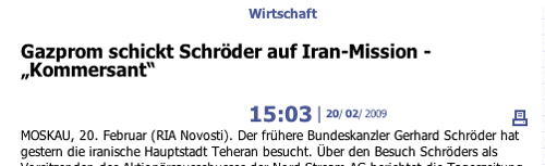 Während in deutschen Medien noch darüber gerätselt wurde, weshalb wohl der ehemalige Bundeskanzler in den Iran reise, nannte der deutschsprachige Dienst von RIA Nowosti ganz unverblümt Auftrag und Auftraggeber.... |