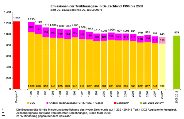 Wegen der schlechten Wirtschaftslage hat Deutschland sein im Rahmen der EU übernommenes Treibhausgas-Minderungsziel nicht nur frühzeitig erreicht, sondern sogar übertroffen. Dies geht aus einer gemeinsamen Pressemitteilung hervor, die das Umweltbundesamt und das Bundesumweltministerium am 29. März veröffentlichten. Demnach ist 2008 der Gesamtausstoß aller Treibhausgase gegenüber dem Vorjahr um fast 12 Millionen auf 945 Millionen Tonnen gesunken. Gegenüber dem Basisjahr 1990 ist das ein Rückgang um 287 Millionen Tonnen oder um 23,3 Prozent. In der 2002 vereinbarten EU-Lastenteilung (020302) auf Grundlage des Protokolls von Kyoto (971215) hat sich Deutschland verpflichtet, seine Treibhausgas-Emissionen im Zeitraum zwischen 2008 und 2012 um 21 Prozent auf 974 Millionen Tonnen zu senken. Diese Zielmarke war bereits in den Jahren 2005 und 2007 erreicht worden. Zwischendurch waren die Emissionen aber wieder angestiegen. Infolge der Wirtschaftskrise sind nun für das das erste Jahr des bis 2012 reichenden Zielkorridors noch deutlich niedrigere Emissionen an CO2 und anderen Treibhausgasen zu verzeichnen. Ob dies in den restlichen vier Jahren so bleibt und zumindest im Durchschnitt aller fünf Jahre die Zielmarke gehalten werden kann, wird wohl ebenfalls stark von der Wirtschaftslage abhängen.