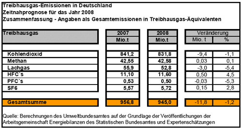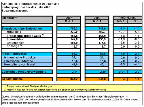 Den größten Anteil an dem 2008 erreichten Rückgang haben die Kohlendioxid-Emissionen, die etwa mit 88 Prozent zur deutschen Treibhausgasbilanz beitrugen: Sie sanken um 9,4 Millionen Tonnen oder um 1,1 Prozent. Trotz dieses Rückgangs der Emissionen stieg der Primärenergieverbrauch um etwa 1 Prozent. Dieses Zurückbleiben der Emissionen hinter dem Energieverbrauch erklärt das Umweltbundesamt mit einer Verschiebung des Energieträger-Mixes hin zu den emissionsärmeren Brennstoffen Gas und Öl sowie der verstärkten Nutzung erneuerbarer Energien, während sich im Kraftwerkssektor sowie in der Eisen- und Stahlindustrie der Einsatz von Steinkohle um rund 7 Prozent und der von Braunkohle um etwa 3,5 Prozent gegenüber 2007verringerte.