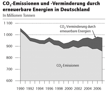 Nach diesem DIW-Schaubild wären die CO2-Emissionen in Deutschland seit 1992 mehr oder weniger auf demselben Niveau geblieben, wenn nicht die erneuerbaren Energien für einen deutlichen Rückgang gesorgt hätten. Grafik: DIW