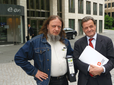 des Bunds der Energieverbraucher, Aribert Peters, vor der Düsseldorfer E.ON-Zentrale