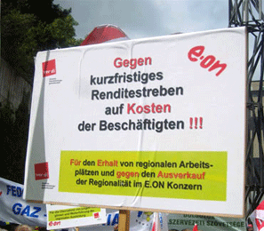 Mit Trillerpfeifen und Buhrufen protestierten am 18. Juni Tausende von E.ON-Beschäftigten vor der Düsseldorfer Zentrale des Konzerns gegen das Sparprogramm, das der Vorstand im Herbst vergangenen Jahres ankündigte (081008) und inzwischen umsetzt. Offiziell handelt es sich um ein Programm zur Steigerung von "Effizienz" und "Wettbewerbsfähigkeit", mit dem bis 2012 ein "Verbesserungspotenzial von bis zu 1,5 Milliarden Euro" erreicht werden soll. Die Konzernspitze hat sich dafür die schöne Bezeichnung "perform to win" einfallen lassen. Immer größere Teile der Belegschaft übersetzen das anglomanische Management-Kauderwelsch aber mit dem beabsichtigten Abbau von Arbeitsplätzen. Die Gewerkschaft Verdi befürchtet, daß E.ON sich von insgesamt 10.000 Mitarbeitern trennen will: Europaweit sei der Abbau von bis zu 6000 Arbeitsplätzen vorgesehen. Zusätzlich würden bis zu 4000 Stellen aus dem Konzern ausgelagert, und zwar hauptsächlich deshalb, um durch "Tarifflucht" die Personalausgaben noch weiter senken zu können.