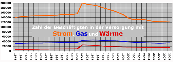Wie diese Grafik zeigt, hat die Zahl der Beschäftigten in der Strom-, Gas- und Wärmeversorgung bis Ende der achtziger Jahre kontinuierlich zugenommen. Nach der Einbeziehung der neuen Bundesländer in die Statistik ab 1991 gab es beim Strom kurzzeitig sogar 200.600 Beschäftigte. Schon 1992 begannen dann aber die Stromversorger mit dem Personalabbau. Im Jahr 2008 war die Zahl der Arbeitsplätze auf 60 Prozent des gesamtdeutschen Niveaus von 1991 abgeschmolzen. Ähnlich, wenn auch nicht ganz so drastisch, verlief die Entwicklung in den anderen Geschäftsgebieten von Unternehmen der Energie- und Wasserversorgung. Die genauen Zahlen für die einzelnen fachlichen Betriebsteile sind der untenstehenden Tabelle zu entnehmen. |